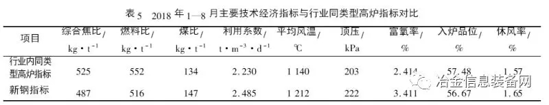 2018 年1—8 月新鋼2 500 m3 高爐主要技術(shù)經(jīng)濟(jì)指標(biāo)與行業(yè)內(nèi)同類型高爐指標(biāo)對比見表5。